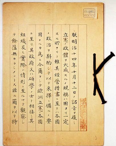 Keywords: Imperial Order to Dispatch Mission Head Plenipotentiary Ito to Europe 1.png ru П иказ импе ато а об отп авке в Ев опу миссии во главе с полномочным послом Ито для изучения конституционных фо м п авления en Imperial Order to Dispatch Mission Head Plenipotentiary Itō to Europe to Study Constitutional Forms of Government 1882 http //www wdl org/item/7369/ Meiji Emperor Custom license marker 2014 02 22 PD-Japan Uploaded with UploadWizard Meiji Constitution