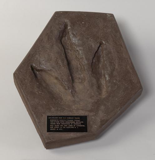| Keywords: Impression of a Dinosaur Trace Fossil Footprint - NARA - 7787788.jpg Scope and content This artifact is a fiberglass replica of an impression of a 200 million-year-old Eubrontes giganteus dinosaur track that was discovered in 1970 in a Roseland New Jersey quarry by two high school students The impression was given as a gift by the students Paul Olsen and Anthony Lessa to President Richard Nixon in 1972 General notes 7787788 Local identifier D 1972 4467 President 1969-1974 Nixon White House Gift Unit 01/20/1969 - 08/09/1974 Richard Nixon Library LP-RN 18001 Yorba Linda Boulevard Yorba Linda CA 92886 Record group Collection RN-MUS Richard Nixon Presidential Library Museum Collection 1913 - 1994 Record group ARC 2734809 Domestic Gifts Received by President Richard Nixon and Mrs Patricia Nixon compiled 1969 - 1974 Series ARC 2734829 File unit File unit ARC Variant control numbers Other Identifier 17225 This is the NARA internal exhibit tracking number Other versions Other pages NARA-cooperation PD-USGov Dinosaur footprints in the United States Eubrontes |