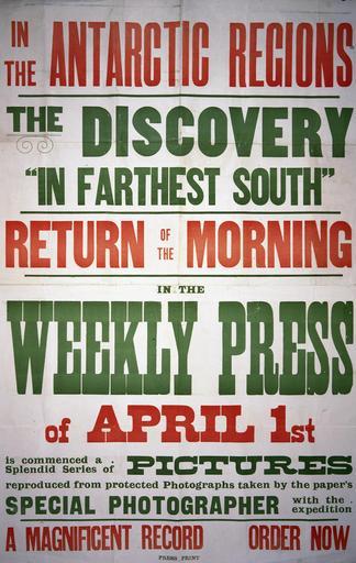| Keywords: text sign signboard outdoor Arrangement of text in red and green on cream paper. Quantity: 1 colour photo-mechanical print(s) (broadsheet). Physical Description: Colour relief print or letterpress on broadsheet 755 x 509 mm. Christchurch Press Company Ltd. In the Antarctic regions; The 'Discovery' "In farthest south"; Return of the 'Morning' in the Weekly Press of April 1st is commenced a splendid series of pictures reproduced from protected photographs taken by the paper's special photographer with the expedition. A magnificent record; order now. Press Print. [ca 1904].. Ref: Eph-D-ANTARCTICA-1904-01. Alexander Turnbull Library, Wellington, New Zealand. natlib.govt.nz/records/22883784 Arrangement of text in red and green on cream paper. Quantity: 1 colour photo-mechanical print(s) (broadsheet). Physical Description: Colour relief print or letterpress on broadsheet 755 x 509 mm. Christchurch Press Company Ltd. In the Antarctic regions; The 'Discovery' "In farthest south"; Return of the 'Morning' in the Weekly Press of April 1st is commenced a splendid series of pictures reproduced from protected photographs taken by the paper's special photographer with the expedition. A magnificent record; order now. Press Print. [ca 1904].. Ref: Eph-D-ANTARCTICA-1904-01. Alexander Turnbull Library, Wellington, New Zealand. natlib.govt.nz/records/22883784 |