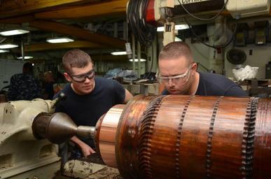 | Keywords: In the machine shop 130826-N-WC566-058.jpg en Machinery Repairman 1st Class Nathan Kopp right and Machinery Repairman Fireman Bradley Widby both assigned to the submarine tender USS Frank Cable AS 40 cut a commutater using a lathe in the machine shop A commutater is used to produce an electrical current for shipboard power aboard submarines Frank Cable forward deployed to the island of Guam conducts maintenance and support of submarines and surface vessels deployed in the U S 7th Fleet area of responsibility U S Navy photo by Mass Communication Specialist Seaman Apprentice Gabrielle Joyner/Released 2013-08-26 Petty Officer 3rd Class Gabrielle Joyner https //www dvidshub net/image/1009442 130826-N-WC566-058 2013-09-03 22 41 GU PD-USGov-Military-Navy USS Frank Cable AS-40 Images from DoD uploaded by Fæ |