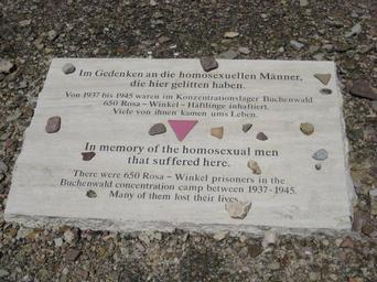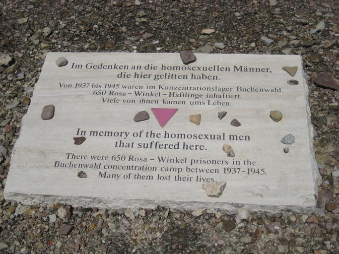 | Keywords: In memory of homosexual.JPG  ru В память о п едставителях сексуальных меньшинств погибших в Бухенвальде de Erinnerungstafel an die im KZ Buchenwald inhaftierten und getöteten Homosexuellen en Memorial plaque of the homosexual prisioners in Buchenwald concentration camp Own Gorodilova 2009-08-19 other fields 1 inscription inscription <big>Im Gedenken an die homosexuellen Männer <br />die hier gelitten haben </big><br /><br />Von 1937 bis 1945 waren im Konzentrationslager Buchenwald<br />650 Rosa-Winkel-Häftlinge inhaftiert <br />Viele von ihnen kamen ums leben de inscription <big>In memory of the homosexual men<br />that suffered here </big><br /><br />There were 650 Rosa-Winkel prisoners in the<br />Buchenwald concentration camp between 1937-1945 <br />Many of them lost their lives en Buchenwald memorials Plaques in Weimar Monuments and memorials to LGBT topics Pink triangles |