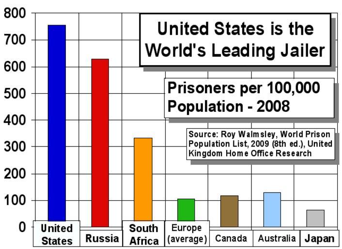 Keywords: Incarceration rates worldwide.gif graph Selected incarceration rates worldwide The stats source is the World Prison Population List 8th edition http //www scribd com/destinyschildren/d/25301071-World-Prison-Population-List-2008 PDF file By Roy Walmsley Published in 2009 International Centre for Prison Studies School of Law King's College London See also the latest data here http //prisonstudies org/info/worldbrief/wpb_stats php World Prison Brief Compare many nations Select from menu prison population totals prison population rates highest to lowest percentage of pre-trial detainees / remand prisoners within the prison population percentage of female prisoners within the prison population percentage of foreign prisoners within the prison population and occupancy rates See also en List of countries by incarceration rate http //www november org/graphs/LeadingJailer gif See date on chart November Coalition http //www november org <br> Sentence with November org contact info removed from the bottom of the chart by User Timeshifter See Commons Watermarks See license information section below http //www november org/graphs is a November Coalition page with charts That page says These graphs are in the public domain http //www november org/graphs The November Coalition Imprisonment and detention rates Bar charts |