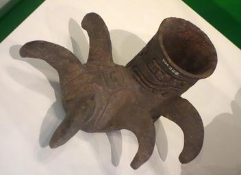 | Keywords: Incised bat claw vessel with glyph reptile's eye on paw, and cylinder, Zapotec, Oaxaca, Mexico, 200-500 AD, clay - Royal Ontario Museum - DSC04514.JPG en Exhibit in the Royal Ontario Museum Toronto Ontario Canada This work is old enough so that it is in the public domain Photography was permitted in the museum without restriction 2013-10-08 16 38 08 own Daderot cc-zero Zapotec ceramics in the Royal Ontario Museum Uploaded with UploadWizard | ||||