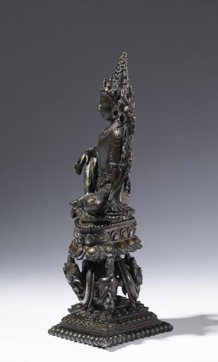 | Keywords: Indian - Bodhisattva Maitreya - Walters 543080 - Left Side.jpg This sumptuous bodhisattva is the future Buddha Maitreya recognizable by the small pot resting on the lotus stem and by the stupa nearly hidden in his elaborate headdress Solid dome-shaped structures called stupas sometimes hold relics of the Buddha Shakyamuni It can be imagined that Maitreya is honoring Shakyamuni by placing his relics on his head Originally the sculpture flanked a statue of Shakyamuni with the bodhisattva Avalokiteshvara on the other side An inscription on the base names the elderly monk Sadhurakshita donor of this image to a monastery century 12 bronze with silver and copper inlay cm 18 4 14 7 6 accession number 54 3080 843 John and Berthe Ford Baltimore date and mode of acquisition unknown Walters Art Museum John Berthe Ford 2009 under base place of origin Bihar India Walters Art Museum license Art of India in the Walters Art Museum Media contributed by the Walters Art Museum needs category review |