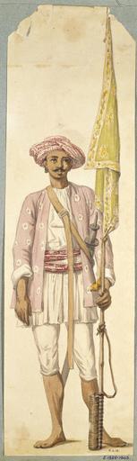 | Keywords: Indian soldier of Tipu Sultan's army.jpg Indian soldier of Tipu Sultan's army using his rocket as a flagstaff by British artist Robert Home The traditional costume of Tipu's infantry generally consists of a 'Tyger Jacket' a long purple woollen shirt with white diamond formed spots on it On his head the soldier wears a red and white muslin turban matching the red sash around his waist Beneath his white trousers his legs and feet are bare Place of Origin Madras India made Date 1793-1794 made Artist/maker Home Robert born 1752 - died 1834 artist Materials and Techniques Watercolour Dimensions Height 15 8 cm corners cut; set within fold-over card mount Width 10 2 cm Descriptive line Painting by a British artist; Robert Home Indian soldier rocket man of Tipu Sultan's army using his rocket as a flagstaff Madras 1793-1794 Bibliographic References Citation Note/Abstract NAL no Buddle Anne 1990 'Tigers Round the Throne The Court of Tipu Sultan 1750-1799 ' Zamana Gallery Publication London pp 26 55 Materials Paper; Gouache Subjects depicted Man; Rocket Categories Paintings Collection code IND 1793-1794 made http //collections vam ac uk/item/O68017/painting/ Home Robert born 1752 - died 1834 artist PD-old-100 Uploaded with UploadWizard Tipu Sultan's Summer Palace Soldiers of India in art People of the Kingdom of Mysore Paintings of men of Karnataka 1790s paintings from India 1793 in Mysore |