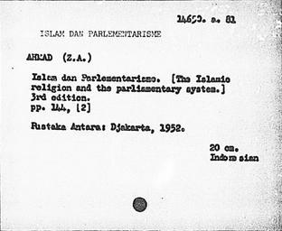 Keywords: This card is part of a card catalogue of printed books held within the Indonesian collections of the British Library. These books were published before 1982. card catalogue indonesian