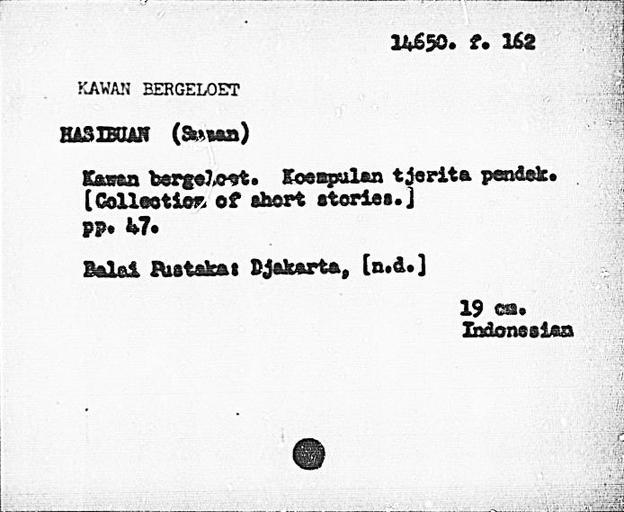 Keywords: This card is part of a card catalogue of printed books held within the Indonesian collections of the British Library. These books were published before 1982. card catalogue indonesian