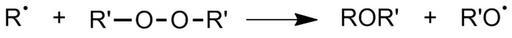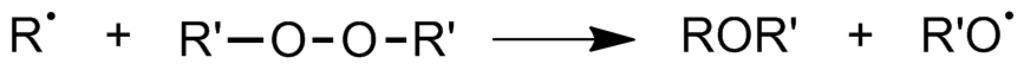 Keywords: Initiation - side reactions.png en Reaction of polymer chain R with other species in reaction own Chem538w10grp6 Use TeX \mathrm R \bullet+R'-O-O-R'\longrightarrow ROR'+R'O \bullet Polymerization Reaction mechanisms