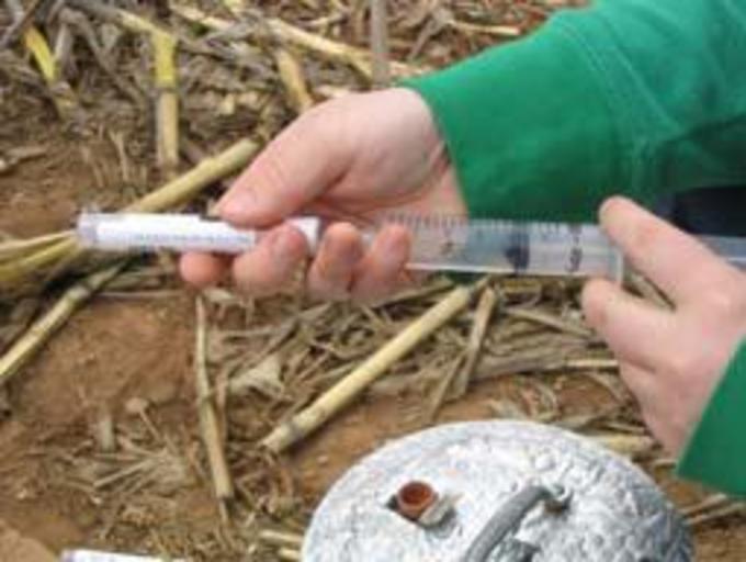 Keywords: Injecting gas sample.JPG en Picture of injecting a gas sample into an exetainer vial Own Djanes Injection medicine