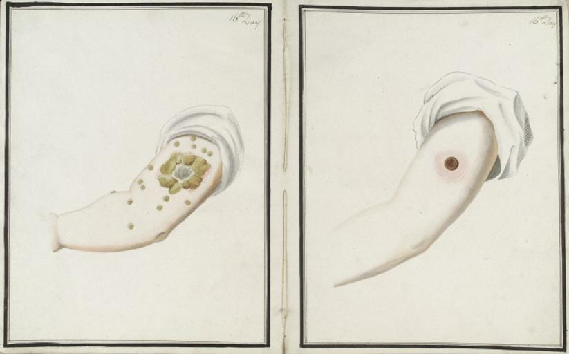 | Keywords: Inoculation day 16.png en The progress of smallpox L and cowpox R inoculations sixteen days after administration From en Wellcome Foundation http //images wellcome ac uk/indexplus/result html sform wellcome-images _IXACTION_ query 24 3Dtoday _IXFIRST_ 1 3Did_ref L0039173 _IXSPFX_ templates/t _IXFPFX_ templates/t _IXMAXHITS_ 1 _IXSESSION_ 50yYEj41gVI George Kirtland 1802 PD-old-100 Vaccinations Illustrations of smallpox Cowpox History of vaccination | ||||