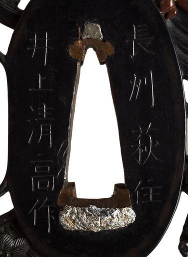 | Keywords: Inoue Kiyotaka - Tsuba with the Samurai Watanabe no Tsuna Battling a Demon at Rashomon Gate - Walters 51169 - Mark A.jpg  This tsuba shows Watanabe no Tsuna a warrior who lived in the late 10th and early 11th century One stormy night he lay in wait at the Rashomon Gate in Kyoto for one of the last demons left in the city In the middle of the night he felt something tugging at his helmet Striking out with his sword he cut off the demon's arm The demon ran away and Tsuna kept the arm locked in an iron box On the tsuba Tsuna can be seen riding his horse on the right Above him the demon pulls at his helmet Storm clouds swirl above the demon The Rashomon Gate is at the lower left below the hole for the utility knife The Rashomon Gate is the same gate that figures in Akira Kurosawa's famous film of that name between 1790 1840 Edo shakudo with gold and copper cm 7 3 accession number 51 169 23087 Henry Walters Baltimore date and mode of acquisition unknown Walters Art Museum Henry Walters Acquired by Henry Walters Transcription Inscribed choshu hagi ju/inouye kiyotaka saku; Translation Inscribed Living at Hagi in Nagato province/Made by Inouye Kiyotaka place of origin Hagi Japan Walters Art Museum license Tsuba in the Walters Art Museum Inoue Kiyotaka Media contributed by the Walters Art Museum needs category review |