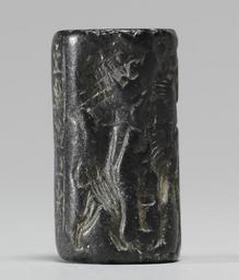 Keywords: Inscriptions - Walters 42582 - Side B.jpg The depicted scene includes a lion and a griffin both on hind legs attacking a horned quadruped The horned quadruped's body faces the lion but its head is turned to face the griffin Behind the griffin is another figure the top of which is difficult to read but the legs on which it stands are that of a bull bull-man A cuneiform inscription in two registers borders the scene date Old Babylonian black stone cm 2 5 1 3 h x diam accession number 42 582 12556 Sadie Jones Mrs Henry Walters New York date and mode of acquisition unknown Sale Joseph Brummer New York 1941 Walters Art Museum 1941 by purchase Museum purchase 1941 Inscription place of origin Egypt Walters Art Museum license Cylinder seals in the Walters Art Museum Art of the ancient Near East Walters cylinder seal 42582 Walters Art Museum cylinder seals with cuneiform Media contributed by the Walters Art Museum needs category review