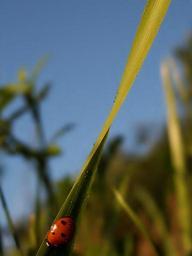 Keywords: insect ladybug red grass blade of grass sky meadow blue shelter morning dew