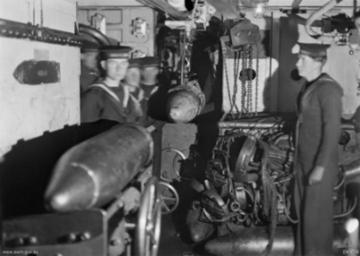 Keywords: InsideHMASAustraliaTurret1918.jpg AWM caption Scotland Firth of Forth Inside a turret on the battle cruiser HMAS Australia Five seamen wait as the supply of shells passes from the magazine to a 12 inch gun <br>Identified left to right Leading Seaman Keith James Trueman of Thebarton SA; Boy First Class W R Edwards; Boy First Class Kenneth William Carswell Bourne of West Maitland NSW; unidentified; Able Seaman Roger Audley Tuxworth of Brisbane Qld far right EN0014 1918-12 Photographer not identified PD-AustraliaGov DEFAULTSORT Australia BL 12 inch Mk X naval gun Black and white photographs HMAS Australia 1911