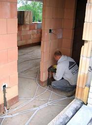 Keywords: Installing electrical wiring2.jpg en Installing electrical wiring the old way This kind of electrical wire installation is still commonly practice in Europe yet is wasteful allot of brick is lost due to the cutting time-consuming not very handy when there is a burned trough/damaged wire A better alternative is the use of cable trays aldough they are somewhat more expensive Own KVDP 2008-06-17 Cable lining |