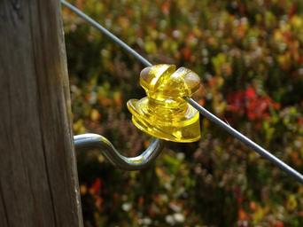 Keywords: insulator isolated shielding barrier fencing screw-in fixed clamped yellow metal shiny transparent mount cow wire protection wiry
