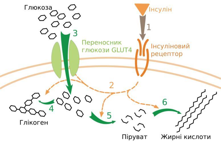 | Keywords: Insulin glucose metabolism uk.svg  uk Вплив інсуліну на захоплення і метаболізм глюкози Інсулін зв'язується зі своїм  ецепто ом 1 внаслідок чого  озпочинається каскад активації  ізних білків 2 Зок ема пе еносник Glut-4 т анслокується до плазматичної мемб ани і т анспо тує глюкозу до цитозолю 3  озпочинається синтез глікогену 4 гліколіз 5 та синтез жи них кислот 6 2012-06-17 File Insulin glucose metabolism ZP svg XcepticZP wikipedia en Custom license marker 2012 06 16 XcepticZP Uploaded with UploadWizard Insulin Diagrams in Ukrainian Metabolic pathways |