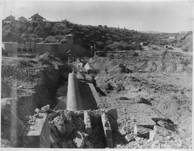 | Keywords: Intake diversion dam. General view from north abutment before removal of portions of old dam. - NARA - 294576.jpg Scope and content Photograph from Volume One of a series of photo albums documenting the construction of Roosevelt Dam Stewart Dam and other related work on the Salt River Project in Arizona General notes 294576 Local identifier Department of the Interior Bureau of Reclamation Engineering and Research Center 05/18/1981 - 03/04/1988 NARA's Rocky Mountain Region Denver NRGA Building 48 Denver Federal Center West 6th Avenue and Kipling Street Denver CO 80225-0307 1936 Record group Record Group 115 Records of the Bureau of Reclamation 1889 - 2008 Record group ARC 444 Photograph albums compiled 1903 - 1972 Series ARC 293611 File unit File unit ARC Variant control numbers NAIL Control Number NRG-115-CONSTPHO85006-SALTRIVERI284 Other versions <gallery> File Intake diversion dam General view from north abutment before removal of portions of old dam - NARA - 294576 tiff tif File Intake diversion dam General view from north abutment before removal of portions of old dam - NARA - 294576 jpg jpg </gallery> NARA-cooperation PD-USGov Construction of the Roosevelt Dam |