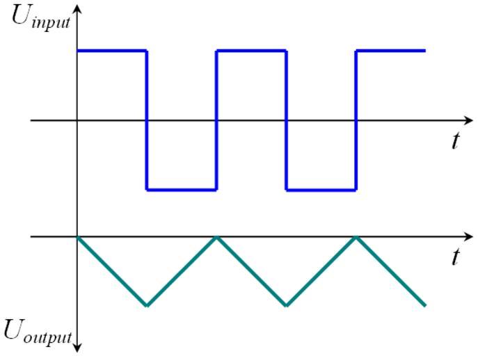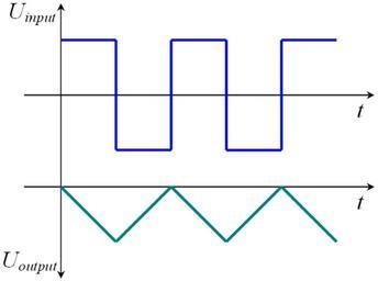 Keywords: Integrator-scheme-3.png Изходен сигнал на интег ато п и подаване на входен импулсен сигнал Опе ационният усилвател се зах анва с еднополя но зах анване -E own 2008-08-28 Spiritia Pulic domain released by the author Waveforms Transverse wave |