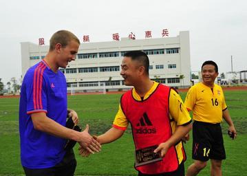| Keywords: Inter-navy sports games in China 150421-N-NM917-158.jpg en 150421-N-NM917-158 ZHANJIANG People's Republic of China - Cryptologic Technician Technical 2nd Class Christopher Duggas attached to the U S 7th Fleet Flagship USS Blue Ridge shakes hands with a People's Liberation Army Navy sailor following an inter-navy soccer game Blue Ridge is conducting a port visit to Zhanjiang to build naval partnerships with China's South Sea Fleet to ensure peace and prosperity for the entire region 2015-04-21 April 21 2015 https //www dvidshub net/image/1886599 150421-N-NM917-158 2015-04-21 06 28 ZHANJIANG CN PD-USGov-Military-Navy USS Blue Ridge LCC-19 Images from DoD uploaded by Fæ |