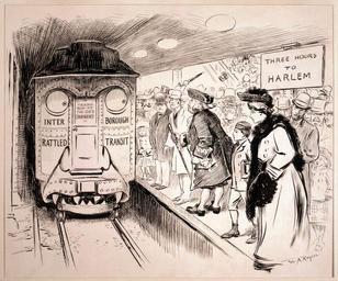 Keywords: Interborough Rattled Transit Restored 2.png Karikatur über den als lausig empfundenen Service bei der ersten New Yorker U-Bahn <br/>Der Zug ist als missmutiges Monstrum gezeichnet der argwöhnisch auf die verärgerte Kundschaft schaut Auf ihm ist zu lesen žInterborough Rattled Transit žInterborough-Schepperbahn und žTrains run at the CO's CONVENIENCE žZüge fahren nach Belieben des Chefs Das Schild auf dem Bahnsteig kündigt an die Fahrzeit nach Harlem betrüge ždrei Stunden Political cartoon that ran in the New York Herald on March 24 1905 regarding lousy service of the Interborough Rapid Transit integrated into the New York City Subway in 1940 The subway car is labeled Interborough Rattled Transit with a sign that states Trains run at the Co 's convenience Above the waiting patrons is a sign that reads Three hours to Harlem Caricature sur le service misérable dans « l'Interborough Rattled Transit » le « chemin de ferraille métropolitain » ou les trains « run at the CO's CONVENIENCE » sont mets en service quand le monsieur le chef le fait à sa tête Interborough_Rattled_Transit_Restored png 2009-08-06 10 45 UTC Interborough_Rattled_Transit_Restored png Rogers W A William Allen 1854-1931 artist Restoration wadester16 derivative work Time3000 <span class signature-talk >talk</span> PD-old original upload log This image is a derivative work of the following images File Interborough_Rattled_Transit_Restored png licensed with PD-old 2009-08-06T05 00 29Z Wadester16 3168x2632 16768175 Bytes <nowiki>Highest-res version</nowiki> 2009-08-05T19 54 20Z Wadester16 2000x1660 6274050 Bytes <nowiki> en asdf Own work by uploader Wadester16 asdf </nowiki> Uploaded with derivativeFX Interborough Rattled Transit by W A Allen |