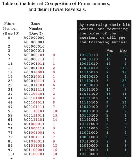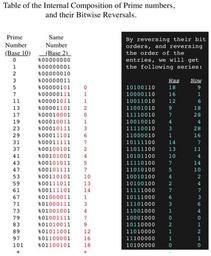 Keywords: Interior-bits-of-primes-&-their-reversals.gif en The table on the left denotes the first 24 primes From this table the column to the right denotes the interior makeup of these primes in red provided they are 5 or more The table on the right denotes the same interior makeup reversed and recorded in reverse order When a bit is reversed the lowest bit becomes the highest bit the second lowest bit becomes the second highest bit the third lowest bit becomes the third highest bit and so on Of course we are only talking about bits above Bit 0 and less than the highest nonzero bit In short the interior bits Reversal of bits is similar to a Boolean operation inasmuch as it involves resequencing the bits without actually losing any of the bits own Dexter Nextnumber 2010-01-09 Number theory Prime numbers Binary numeral system English text |