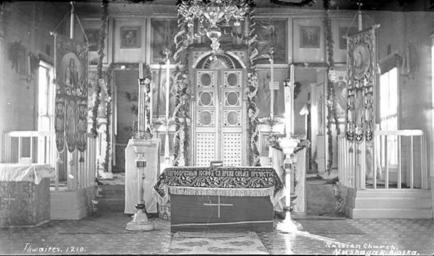 Keywords: Interior of Church of St Peter and St Paul, Russian Orthodox church at Nushagak, ca 1912 (THWAITES 227).jpeg check categories 27 October 2016 2 Photograph Creator John E Thwaites Caption on image Russian Church Nushagak Alaska PH Coll 247 319 Subjects LCTGM Orthodox churches--Alaska--Nushagak; Interiors--Alaska--Nushagak; Russian Orthodox Greek Catholic Church of America--Facilities--Alaska--Nushagak Subjects LCSH Church decoration and ornament--Alaska--Nushagak depicted place United States--Alaska--Nushagak ca 1912 Institution University of Washington UWASH-THWAITES-source accession number thwaites 227 PD-old-auto-1923 1940 Information field Order Number THW160 Images from the John E Thwaites Photographs of Alaska Collection to check Orthodox churches Interiors |