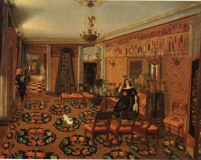 | Keywords: Interior of the living-room by anonim (Russia, 1840s).jpg еизвестный художник се едины 19 века Инте ье гостиной 1840-е Изоб аженная на ка тине гостиная служит п име ом пе е ождения бытового инте ье а к се едине XIX века А хитекту а стала ут ачивать чувство масштаба всех вд уг потянуло на уют захотелось мягкой удобной мебели захотелось асставлять ее как вздумается пишет один из сов еменных исследователей Стены гостиной обильно ук ашены осписью пол пок ыт ков ом с ог омными венками стеклянная го ка с се еб ом почти достигает потолка стол сплошь заставлен фа фо ом С еди всех этих вещей те яются не масштабно изоб аженные фигу ы хозяйки гостиной и ее мужа гене ала с аннинской звездой на г уди http //www bibliotekar ru/rusKart/37 htm 1840-е 19 Paintings of interiors of Russia Files uploaded by Shakko from various sources 1840s interiors in art PD-old |