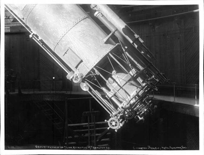 | Keywords: Interior view of Lick Observatory on Mount Hamilton, California, ca.1904-1909 (CHS-3942).jpg  en <br> Interior view of Lick Observatory on Mount Hamilton California ca 1904-1909 Photograph of an interior view of a dome at Lick Observatory on Mount Hamilton California showing the eye-piece end of the 36 inch refractor telescope ca 1904-1909 Seven small wheels attached to spoked rods around the end of the telescope adjust various lens distances A small hatch in the side of the telescope provides access to the inside The barrel of the telescope consists of multiple rings rivited together The inside of the dome of the observatory is visible in the background above the wood walls below A rail runs around the periphery of the curved walls Part of the dome rotating mechanism is visible at the juncture between the dome and walls Part of a platform is visible in the foreground at bottom Call number CHS-3942 Legacy record ID chs-m10555; USC-0-1-1-10703 Photographer James George Wharton Filename CHS-3942 Coverage date circa 1904/1909 Part of collection California Historical Society Collection 1860-1960 Type images Part of subcollection Title Insurance and Trust and C C Pierce Photography Collection 1860-1960 Repository name USC Libraries Special Collections Accession number 3942 Microfiche number 1-100-9 Archival file chs_Volume91/CHS-3942 tiff Repository address Doheny Memorial Library Los Angeles CA 90089-0189 Geographic subject country USA Format aacr2 2 photographs glass photonegative photoprint b w ; 17 x 22 cm Rights Digitally reproduced by the USC Digital Library; From the California Historical Society Collection at the University of Southern California Subject adlf research facilities Project USC Repository email specol usc edu Contributing entity California Historical Society Date created circa 1904/1909 Publisher of the digital version University of Southern California Libraries Format aat photographic prints; photographs Geographic subject state California Subject file heading Observatories -- Lick Observatory Format glass plate negatives Geographic subject mountains Mount Hamilton Access conditions Send requests to address or e-mail given Phone 213 821-2366; fax 213 740-2343 Geographic subject county Santa Clara Subject lcsh Observatories; Telescopes; Astronomical instruments Subject Lick Observatory circa 1904 /1909 date created James George Wharton http //digitallibrary usc edu/cdm/ref/collection/p15799coll65/id/15683 PD-old-70-1923 Images from USC Digital Library uploaded by Fæ California Historical Society Collection 1860-1960 Glass plate negatives Photographs by George Wharton James Lick Observatory |