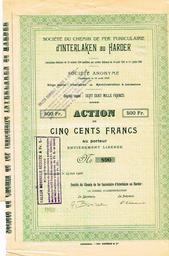 Keywords: Interlaken Harder 1906.jpg en Share of the Société du Chemin de fer funiculaire d'Interlaken au Harder issued 15 May 1906 de Aktie über 500 Francs der Société du Chemin de fer funiculaire d'Interlaken au Harder vom 15 Mai 1906; Auflage 1'400 Stück Am 6 September 1923 Nennwertreduktion auf 100 Franken am 20 April 1940 auf 5 Franken Heute noch als Stammaktie gültig Die Konzession zum Bau dieser Bahn wurde am 10 Oktober 1890 erteilt die AG erst am 31 August 1905 gegründet Sammlung eines Mitglieds des Ersten Deutschen Historic-Actien-Clubs e V EDHAC e V ; kl Unbekannte Autoren und Grafiker; Scan vom EDHAC e V 1906-05-15 PD-old-70-1923 Bonds and Shares of EDHAC members Harderbahn |