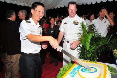 Keywords: International Maritime Defense Exhibition Asia 2009 DVIDS172843.jpg en Commanding Officer of Arleigh Burke-class guided missile destroyer USS Kidd Cmdr Chuck Good participates in a cake cutting ceremony with Chief of Republic of Singapore Navy Rear Adm Chew Men Leong during the International Maritime Defense Exhibition Asia 2009 a biennial conference showcasing the latest in maritime defense technology Kidd is part of John C Stennis Carrier Strike Group and is in Singapore for a port visit as part of a scheduled six-month deployment to the western Pacific Ocean 2009-05-14 https //www dvidshub net/image/172843 090514-N-+++++-067 2009-05-19 04 22 SINGAPORE CITY SG PD-USGov-Military-Navy Chew Men Leong Images from DoD uploaded by Fæ |