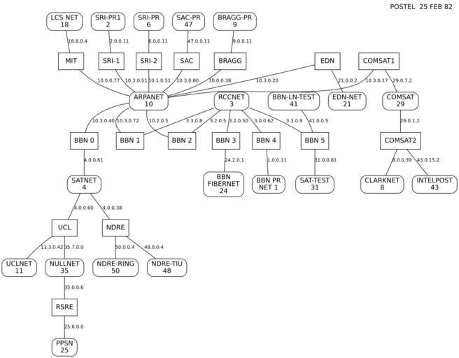 Keywords: Internet82.svg Contemporary map of the entire Internet in semi-production phase many hosts attached to the ARPANET were still using NCP at this point in February 1982 The ovals are sites/networks some sites included more than one physical network the rectangles are individual routers No individual hosts are shown Drawn by Jon Postel of the Information Sciences Institute under a DARPA research contract as part of Internet development Eine Zeitgenössische Entwurfsansicht des gesamten Internets im Februar 1982 Die Ovale bezeichnen Sites/Netzwerke einige bestehen dabei aus mehreren Physikalischen Netzwerken die Rechtecke stellen individuelle Router dar einzelne Hosts werden nicht dargestellt Gezeichnet von Jon Postel vom Information Sciences Institute unter dem DARPA research contract als Teil der Internet Entwicklung Mapa contemporáneo de Internet en fase de semi-producción varios hosts unidos a ARPANET cuando aún se usaba el NCP en Febrero de 1982 Los óvalos son sitios/conexiones algunos sitios incluían más de una conexión física los rectángulos son routers individuales No se muestran los hosts individuales Dibujado por Jon Postel del Instituto de Ciencias de la Computación bajo un contrato de investigación como parte del desarrollo de Internet Vue schématique d ™Internet alors en phase de semi-production datant de février 1982 A cette époque NCP était encore largement utilisé par les systèmes connectés à ARPANET Les ovales représentent des sites ou réseaux certains sites étant constitués de plusieurs réseaux physiques alors que les rectangles identifient les routeurs Les ordinateurs hôtes ne sont pas représentés Dessiné par Jon Postel en poste à l ™Institut des sciences informatiques Information Sciences Institute au sein de l ™Université de Californie du Sud contribuant au développement d ™Internet dans le cadre d ™un contrat de recherche de la DARPA Rappresentazione della rete internet nel febbraio 1982 Gli ovali rappresentano siti/reti alcune costituite da più reti fisiche mentre i rettangoli sono i singoli router I singoli host non sono rappresentati Disegno realizzato da Jon Postel nell'ambito di un programma di ricerca della DARPA sullo sviluppo di internet Information Sciences Institute Instituto de Ciencias de la Computación Universidad del Sur de California Institut des sciences informatiques Information Sciences Institute établissement de l ™Université de Californie du Sud Uploaded to English Wikipedia on 30th August 2005 by Jnc from English Wikipedia ” uploaded to Commons on 17th February 2006 by Nethac DIU from Spanish Wikipedia Renamed on Saturday 29 July 2006 Hochgeladen in das Englische Wikipedia am 30 August 2005 von Jnc vom Englischen Wikipedia ” Bei Commons hochgeladen am 17 Februar 2006 von Nethac DIU aus dem Spanischen Wikipedia Umbenannt am Samstag den 29 Juli 2006 Subido a la Wikipedia inglesa en 30 de Agosto de 2005 por Jnc de la Wikipedia Inglesa; subida a Commons el 17 de Febrero de 2006 por Nethac DIU de la Wikipedia Española Renombrada el sábado 29 de julio de 2006 Ajouté à la version anglaise de Wikipedia le 30 août 2005 par Jnc Wikipedia en anglais Ajouté aux Commons le 17 février 2006 par Nethac DIU Wikipedia en espagnol Renommé le 29 juillet 2006 Jon Postel converted to SVG using Graphviz by Pitel PD-USGov-Military 200px     200px Created with Graphviz PD-USGov Graphviz source <source lang dot >graph Internet82 graph overlap compress sep 1 label POSTEL 25 FEB 82 fontname sans-serif labelloc t labeljust r bgcolor transparent edge fontsize 10 fontname sans-serif node shape box bgcolor blue fontname sans-serif SRI1 label SRI-1 SRI2 label SRI-2 SAC BRAGG MIT EDN COMSAT1 COMSAT2 BBN2 label BBN 2 BBN1 label BBN 1 BBN0 label BBN 0 BBN3 label BBN 3 BBN4 label BBN 4 BBN5 label BBN 5 UCL NDRE RSRE node style rounded ARPANET label ARPANET\n10 SRIPR1 label SRI-PR1\n2 SRIPR2 label SRI-PR\n6 SACPR label SAC-PR\n47 BRAGGPR label BRAGG-PR\n9 LCSNET label LCS NET\n18 EDNNET label EDN-NET\n21 COMSAT29 label COMSAT\n29 CLARKNET label CLARKNET\n8 INTELPOST label INTELPOST\n43 RCCNET label RCCNET\n3 SATTEST label SAT-TEST\n31 BBNLNTEST label BBN-LN-TEST\n41 BBNPRNET label BBN PR\nNET 1 BBNFIBERNET label BBN\nFIBERNET\n24 SATNET label SATNET\n4 NDRERING label NDRE-RING\n50 NDRETIU label NDRE-TIU\n48 UCLNET label UCLNET\n11 NULLNET label NULLNET\n35 PPSN label PPSN\n25 SRIPR1 -- SRI1 label 2 0 0 11 SRI1 -- ARPANET label 10 3 0 51 SRIPR2 -- SRI2 label 6 0 0 11 SRI2 -- ARPANET label 10 1 0 51 SACPR -- SAC label 47 0 0 11 SAC -- ARPANET label 10 3 0 80 BRAGGPR -- BRAGG label 9 0 0 11 BRAGG -- ARPANET label 10 0 0 38 MIT -- ARPANET label 10 0 0 77 LCSNET -- MIT label 18 8 0 4 EDN -- EDNNET label 21 0 0 2 EDN -- ARPANET label 10 3 0 20 COMSAT1 -- ARPANET label 10 3 0 17 COMSAT1 -- COMSAT29 label 29 0 7 2 COMSAT29 -- COMSAT2 label 29 0 1 2 COMSAT2 -- CLARKNET label 8 0 0 39 COMSAT2 -- INTELPOST label 43 0 15 2 ARPANET -- BBN0 label 10 3 0 40 ARPANET -- BBN1 label 10 3 0 72 ARPANET -- BBN2 label 10 2 0 5 RCCNET -- BBN1 label 3 3 0 8 RCCNET -- BBN2 label 3 2 0 5 RCCNET -- BBN3 label 3 2 0 50 RCCNET -- BBN4 label 3 0 0 62 RCCNET -- BBN5 label 3 3 0 9 BBN5 -- SATTEST label 31 0 0 81 BBNLNTEST -- BBN5 label 41 0 0 5 BBN4 -- BBNPRNET label 1 0 0 11 BBN3 -- BBNFIBERNET label 24 2 0 1 BBN0 -- SATNET label 4 0 0 61 SATNET -- UCL label 4 0 0 60 SATNET -- NDRE label 4 0 0 38 NDRE -- NDRERING label 50 0 0 4 NDRE -- NDRETIU label 48 0 0 4 UCL -- UCLNET label 11 3 0 42 UCL -- NULLNET label 35 7 0 0 NULLNET -- RSRE label 35 0 0 6 RSRE -- PPSN label 25 6 0 0 </source> Images with Graphviz source code ARPANET Internet BBN