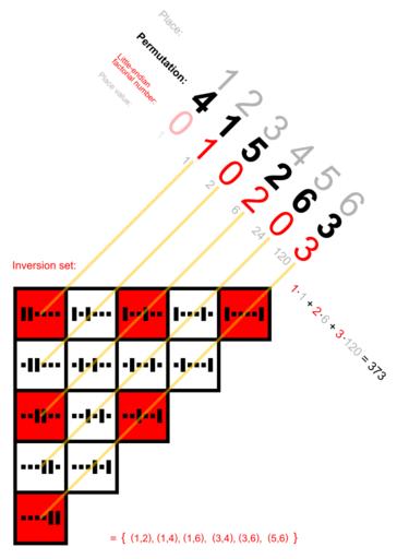 Keywords: Inversion set and vector of a permutation.svg Example of inversions of a permutation The example permutation 4 1 5 2 6 3 has the inversion vector <font color red> 0 1 0 2 0 3 </font><br> and the inversion set <font color red> 1 2 1 4 3 4 1 6 3 6 5 6 </font> <br> The inversion vector reflected factorial number converted to decimal is 373 This permutation is also shown in this array Also the number 373 is found there The inversion set contains 6 of the <math>\tbinom 6 2 </math> 15 2-subsets of a 6-set <br> The triangle is ordered like the square array A018900 compare this triangle Wolfram Alpha shows the inversion vector ã ˆ1 2 3 0 0ã ‰ for this permutation http //www wolframalpha com/input/ i permutation 1 4 2 3 5 6 <br> ã ˆ3 0 2 0 1ã ‰ is shown for its inverse http //www wolframalpha com/input/ i permutation 1 2 4 3 6 5 own Watchduck Inversion set of a 6-element permutation Little-endian factorial numbers Unassessed QI candidates