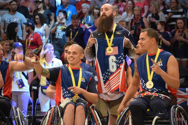 | Keywords: Invictus Games 2016, Wheelchair Basketball 160512-N-WW503-615.jpg en Navy wounded warriors Fire Controlman 3rd Class ret Jason Reyes Electrician's Mate Apprentice ret Steven Davis and Chief Yeoman ret Javier D Rodriguez Santiago pose after winning the gold medal in wheelchair basketball May 12 2016 in Orlando Fla The Invictus Games is an international adaptive sports competition for wounded ill and injured Service members and veterans U S Navy photo by Lt j g Marissa A Cruz/Released <br>Unit Commander Navy Installations Command 2016-05-12 Lt j g Marissa Cruz https //www dvidshub net/image/2600692/invictus-games-2016-wheelchair-basketball 160512-N-WW503-615 2016-05-19 19 28 FL US PD-USGov-Military-Navy 2016 Invictus Games Images from DoD uploaded by Fæ |