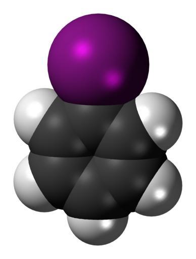 | Keywords: Iodobenzene 3D spacefill.png Space-filling model of the iodobenzene molecule a compound consisting of a benzene ring substituted with an iodine atom Color code 505050 Carbon C black<br> F0F0F0 Hydrogen H white<br> 961496 Iodine I purple<br> 2011-08-02 own DS Visualizer Jynto talk Ball-and-stick version cc-zero Images by Jynto Space-filling models Iodobenzene |