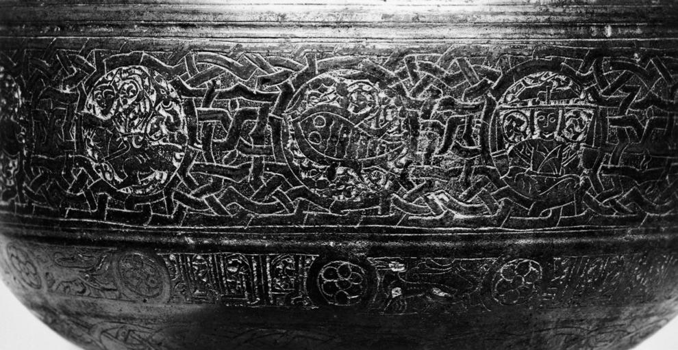 Keywords: Iranian - Bucket with Designs of Roundels and the Zodiac - Walters 54523.jpg The design on this bucket is engraved and inlaid with copper and features twelve roundels the zodiac and interlace century 12 Medieval engraved brass copper inlay handle extended cm 31 21 1 h x diam accession number 54 523 27211 Henry Walters Baltimore date and mode of acquisition unknown Walters Art Museum Henry Walters Acquired by Henry Walters 1913 Inscription Exhibition of Persian Art Iranian Institute New York 1940 Islamic Insights Katonah Gallery Katonah 1980 The World of Islam Saint Mary's College St Mary's City 1981 place of origin Khorasan Iran Walters Art Museum license Islamic metalwork in the Walters Art Museum Art of Iran Media contributed by the Walters Art Museum needs category review |