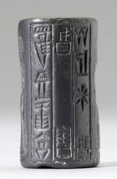 Keywords: Iranian - Cylinder Seal - Walters 42775 - Side A.jpg Walters Art Museum artwork Seated King Man + Inscription <br> Incorrect-Two uses of 42775 Although the Achaemenids used stamp seals for private documents cylinder seals continued to be used for official royal business This seal depicts the king fighting a lion-griffin in two scenes First he engages in close combat with the lion-griffin Second the king standing on a reclining sphinx aims his bow at the mythical beast also standing on a sphinx Between them is the benign god Ahura Mazda in an oval cartouche with a winged disk above between 550 330 BC Achaemenid chalcedony cm 2 8 1 4 accession number 42 775 38841 Sadie Jones Mrs Henry Walters New York date and mode of acquisition unknown Sale Joseph Brummer New York 1941 Walters Art Museum 1941 by purchase Museum purchase 1941 Ancient Persia The Art of an Empire The Walters Art Gallery Baltimore; University Art Museum University of Texas at Austin Austin 1978 place of origin Iran Walters Art Museum license Cylinder seals in the Walters Art Museum Art of Iran Iranian Seated-King Figure and Inscription Walters 42775-No 1 Cuneiform on cylinder seals Walters Art Museum cylinder seals with cuneiform LUGAL king Sumerogram DINGIR god-as-star Sumerogram DUMU son Sumerogram Media contributed by the Walters Art Museum needs category review |