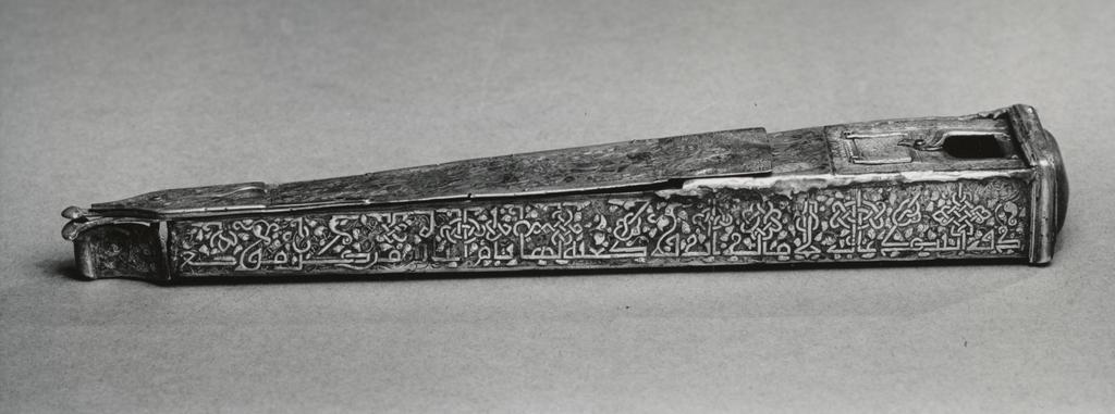 | Keywords: Iranian - Pen and Ink Box - Walters 54509 - Right.jpg This box once contained a pen and in the lower compartment a wad of wool soaked with ink It was carried on the owner's belt and must have belonged to a statesman since its side is inscribed with the maxim Your government shall rise without declining if it has as its basis the largest number of people from every place Hunt imagery like the scenes on the box was popular among the nobility as this sport required the valor and skills also needed in battle ca 1300 Medieval cast brass silver and gold inlay cm 25 1 3 1 accession number 54 509 13800 Henry Walters Baltimore date and mode of acquisition unknown Walters Art Museum Henry Walters Acquired by Henry Walters Translation Your government shall rise without declining if it has as its basis the largest number of people from every place The Arts of Islam Hayward Gallery London 1976 Illuminated Manuscripts Masterpieces in Miniature The Walters Art Gallery Baltimore 1984-1985 place of origin Tabriz Iran Walters Art Museum license Islamic art in the Walters Art Museum Art of Iran Media contributed by the Walters Art Museum needs category review Art of Tabriz Islamic pen boxes |