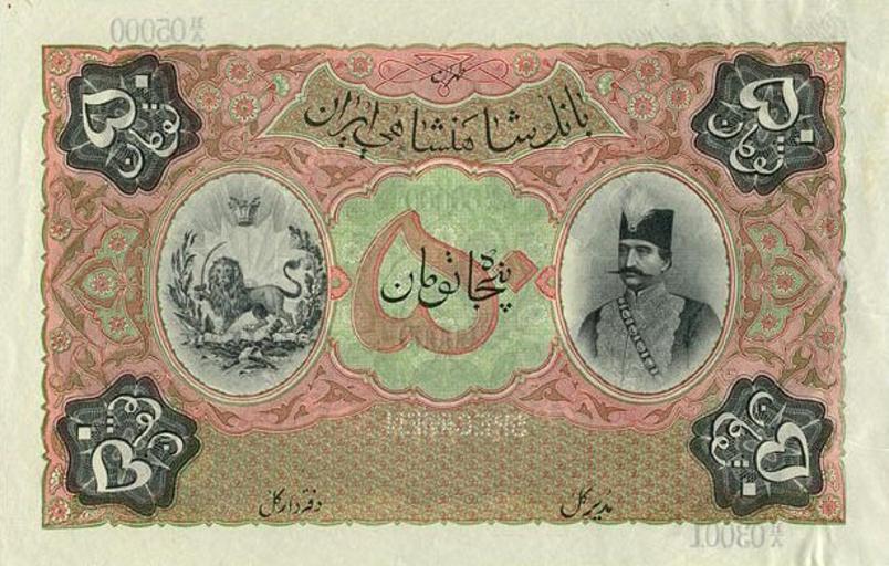| Keywords: IranP7s-50tomans-ND-donatedjs f.jpg en Banknote of Persia - 50 tomans; before 1911 bg Банкнота от Пе сия п еди 1911 г 50 пе сидски тумана 50 пе сидских туманов 1911 Аве с Об азец Импе скиа Банка на Пе сия Импе ский Банк Пе сии банкноти до 1911 http //www banknoteworld com/notedir/mappage html PD-old-100 PD-Iran 1911 banknotes Banknotes of Iran Qajar era Lions in heraldry 50 Toman 500 Rial banknotes Lion and Sun | ||||