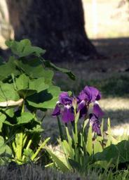 Keywords: iris purple flowers plants green leaves stems flowering ornamental petals blooms blossoms tree trunk background grass sunlight bright day shadows fleurs violet gardens outdoors