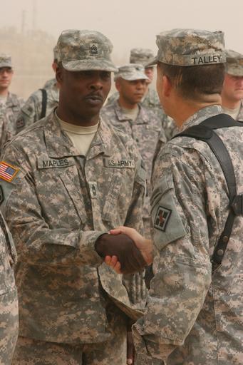 | Keywords: Iron Castles best receive promotion DVIDS116661.jpg en Master Sgt Arthur Maples native of Earle Ark receives his first hand shake from Brig Gen Jeffrey Talley commander 926th Engineer Brigade Multi-National Division “ Baghdad Maples is on his second tour of duty in Iraq He is the non-commissioned officer in charge at the Task Force Iron Claw Academy 2008-09-15 Sgt James Hill https //www dvidshub net/image/116661 116661 2008-09-20 12 49 BAGHDAD IQ PD-USGov Jeffrey W Talley Images from DoD uploaded by Fæ |