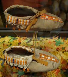 | Keywords: Iroquois (probably) moccasins with quillwork, tin cones, and hair fringe, early 1700s - Bata Shoe Museum - DSC00653.JPG en Exhibit in the Bata Shoe Museum Toronto Ontario Canada This item is old enough so that its design is in the public domain The museum permitted photography without restriction 2013-07-04 11 35 41 own Daderot cc-zero Moccasins in the Bata Shoe Museum Uploaded with UploadWizard | ||||