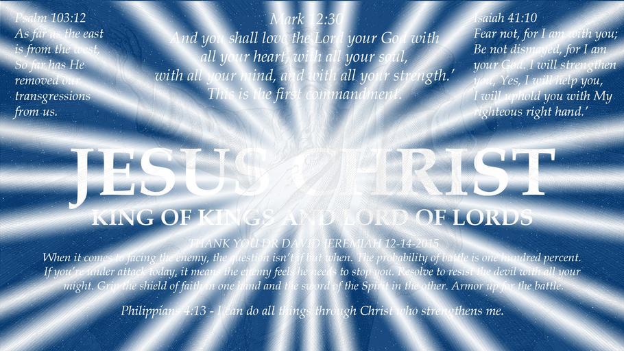 Keywords: god jesus jesus christ jesuschrist god the father godthefather holy spirit holyspirit holy church scripture angels faith prayer pray hope peace love alive forevermore aliveforevermore angel christian righteous king of kings kingofkings heaven archangel god is love godislove prince of peace princeofpeace creator christ the creator christthecreator god the creator godthecreator third heaven thirdheaven awesome alpha and omega alphaandomega wonderful glorious omnipotent almighty bible holy bible holybible armor of god armorofgod glorify hallelujah judgment judgment day judgmentday usa united states of america unitedstatesofamerica sleep christ who strengthens me christwhostrengthensme word of god wordofgod word of god stands forever wordofgodstandsforever shine like stars shinelikestars the lord is my shepherd thelordismyshepherd eternity confess christ confesschrist confess repent repentance humble sinner humble yourself humbleyourself saved lost found salvation praise god praisegod amen word became flesh wordbecameflesh be strong bestrong courage spiritual warfare monochrome depth of field macro pattern texture pastel abstract outdoor Isaiah 41:10 New King James Version (NKJV) Fear not, for I am with you; Be not dismayed, for I am your God. I will strengthen you, Yes, I will help you, I will uphold you with My righteous right hand.’ Psalm 103:12 New King James Version (NKJV) As far as the east is from the west, So far has He removed our transgressions from us. Mark 12:30 New King James Version (NKJV) And you shall love the Lord your God with all your heart, with all your soul, with all your mind, and with all your strength.’ This is the first commandment. Philippians 4:13 New King James Version (NKJV) I can do all things through Christ who strengthens me. THANK YOU DR DAVID JEREMIAH 12-14-2015 www.davidjeremiah.org/site/default.aspx When it comes to facing the enemy, the question isn’t if but when. The probability of battle is one hundred percent. If you’re under attack today, it means the enemy feels he needs to stop you. Resolve to resist the devil with all your might. Grip the shield of faith in one hand and the sword of the Spirit in the other. Armor up for the battle. God: Creation of Light background created in 1860 by Julius Schnorr von Carolsfeld. Public Domain. en.wikipedia.org/wiki/Julius_Schnorr_von_Carolsfeld www.flickr.com/photos/hsga/21146492723/in/dateposted-public/ Isaiah 41:10 New King James Version (NKJV) Fear not, for I am with you; Be not dismayed, for I am your God. I will strengthen you, Yes, I will help you, I will uphold you with My righteous right hand.’ Psalm 103:12 New King James Version (NKJV) As far as the east is from the west, So far has He removed our transgressions from us. Mark 12:30 New King James Version (NKJV) And you shall love the Lord your God with all your heart, with all your soul, with all your mind, and with all your strength.’ This is the first commandment. Philippians 4:13 New King James Version (NKJV) I can do all things through Christ who strengthens me. THANK YOU DR DAVID JEREMIAH 12-14-2015 www.davidjeremiah.org/site/default.aspx When it comes to facing the enemy, the question isn’t if but when. The probability of battle is one hundred percent. If you’re under attack today, it means the enemy feels he needs to stop you. Resolve to resist the devil with all your might. Grip the shield of faith in one hand and the sword of the Spirit in the other. Armor up for the battle. God: Creation of Light background created in 1860 by Julius Schnorr von Carolsfeld. Public Domain. en.wikipedia.org/wiki/Julius_Schnorr_von_Carolsfeld www.flickr.com/photos/hsga/21146492723/in/dateposted-public/