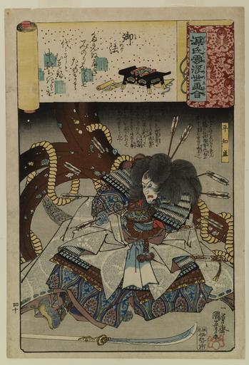 | Keywords: Iseya Ichibei - Genjigumo ukiyo-e awase - Walters 95104.jpg  The great 12th-century general Taira no Tomomori ties himself to an anchor so that he may die by his own hand and not from enemy action as defeat nears in the famous sea battle at Dan-no-ura 1185 In The Tale of Genji as her death approaches Lady Murasaki insists on making the arrangements for her own funeral rites 1845-46 late Edo pigments mulberry paper cm 37 7 25 5 accession number 95 104 7131 Justine Lewis Keidel date and mode of acquisition unknown Walters Art Museum Gift of Justine Lewis Keidel 1986 Signature Ichiyusai Kuniyoshi ga; Transcription Genban ise-shi; Translation First published Ise city The Nature of Loyalty Japanese Warrior Prints of the Nineteenth Century The Walters Art Gallery Baltimore 1989 place of origin Edo present-day Tokyo Japan Walters Art Museum license 2D Japanese prints in the Walters Art Museum Historic samurai prints Media contributed by the Walters Art Museum needs category review Utagawa Kuniyoshi |
