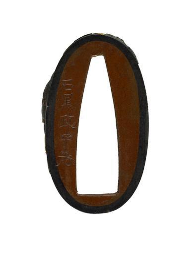 Keywords: Ishiguro Masatsune II - Fuchi with Diving Duck - Walters 511112 - Mark A.jpg The lower half of a duck is shown as it dived below the surface of the water Reeds overhang the top of the composition This is part of a set with Walters 51 1113 ca 1800 1850 late Edo shakudo gold cm 3 7 l accession number 51 1112 547 William T / Henry Walters Collection Baltimore date and mode of acquisition unknown Walters Art Museum Henry Walters Acquired by William T or Henry Walters Signature Ishiguro Masamori kao place of origin Edo present-day Tokyo Japan Walters Art Museum license Fuchi in the Walters Art Museum Ishiguro Masatsune II Media contributed by the Walters Art Museum needs category review