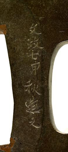 Keywords: Ishiguro Masayoshi I - Tsuba with Autumn Flora - Walters 51309 - Mark B.jpg This tsuba combines five of the celebrated flowers of autumn The uppermost stalk on the right is pampas grass Below that are maiden flowers arrowroot and Chinese bell flowers A tendril of bush clover crosses along the bottom on the tsuba These flowers and grasses were regularly invoked in Japanese poetry and painting to signify autumn 1824 late Edo shakudo gold alloy gold shibuichi and copper cm 6 6 accession number 51 309 35619 Henry Walters Baltimore date and mode of acquisition unknown Walters Art Museum Henry Walters Acquired by Henry Walters Signature Jugakusai Ishiguro Masayoshi kore o horu; Translation Engraved by Jugakusai Ishiguro Masayoshi; Date Bunsei shichi saru shu kore o zo; Translation Made in the autumn of the year of the monkey seventh year of Bunsei 1824 place of origin Edo present-day Tokyo Japan Walters Art Museum license Tsuba in the Walters Art Museum Ishiguro Masayoshi I Media contributed by the Walters Art Museum needs category review |