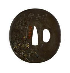 | Keywords: Ishikawa Hirosada - Tsuba with Ch么un Rescuing Gentoku's Infant - Walters 51355 - Back.jpg  Ch魎n Ch Zhao Yun Chao Yun was a 3rd-century warrior fighting in support of the Chinese emperor Gentoku Ch Liu Bei Liu Pei At the battle of Changfan Kiao the emperor had to flee leaving behind his wife and infant son Ch魎n rescued the son While fleeing with the boy he had to leap with his horse across a great chasm On the tsuba Ch魎n is depicted on the right leaping over the chasm The infant's head is barely visible near the horse's mane On the reverse another warrior is shown riding past a tree This may be one of Ch魎n's pursuers 1st half Other date century 19 late Edo shibuichi gold and copper details cm 7 3 accession number 51 355 17534 Henry Walters Baltimore date and mode of acquisition unknown Walters Art Museum Henry Walters Acquired by Henry Walters Signature Kitsuru Hirosada kao ; Signature Shugensai place of origin Edo present-day Tokyo Japan Walters Art Museum license Tosogu Japanese sword fittings in the Walters Art Museum Media contributed by the Walters Art Museum needs category review Ishikawa Hirosada |