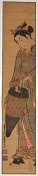 | Keywords: Ishikawa Toyonobu - Woman with umbrella, rain cape and geta.jpg en A young woman with an umbrella She wears a rain-cape and high clogs geta Wide hashira-e 27 5 x 5 5 in ; 70 x 14 cms Coloured by hand with beni overlaid with urushi yellow mustard brown and blue Published c 1742 by Urokogata-ya http //www japaneseprints-london com/images/HPIM0568 jpg Ishikawa Toyonobu 1711-1785 Ishikawa Toyonobu Umbrellas in art Capes vestment in art Geta footwear Ukiyo-e of beautiful women Woodblock prints of the Edo period Hashira-e PD-Art-100 |