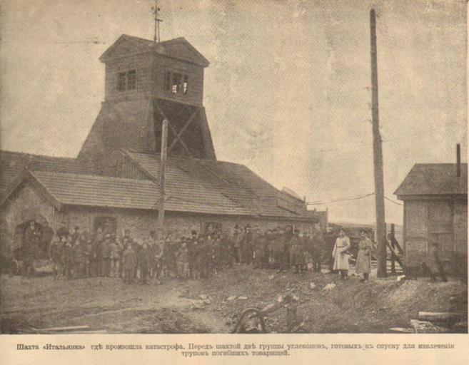 Keywords: Iskri 12 - 4,3.jpg Фотог афия из иллюст и ованного художественно-лите ату ного и юмо истического жу нала с ка икату ами «Иск ы» 12 Воск есенье 18 ма та 1912 г Катаст офа в акеевке Шахта «Итальянка» где п оизошла катаст офа Пе ед шахтой две г уппы углекопов готовых к спуску для извлечения т упов погибших това ищей http //www odin-fakt ru/iskry/_12_jurnala_iskry_god1912/ Iskri 12 - 4 jpg 1 ма та 1912 Фот В Ф овикова PD-RusEmpire Iskri 1912 12 Italianka coal mine 1912 in Makeevka Photographs uploaded by Andrew Butko from various sources less 1000 px on long side