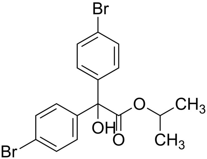 Keywords: Isopropyl 2,2-bis(4-bromophenyl)-2-hydroxyacetate 200.svg validSVG Structure of isopropyl 2 2-bis 4-bromophenyl -2-hydroxyacetate Own 2014-06-09 Emeldir <span class signature-talk ></span> Chemical structure verified https //upload wikimedia org/wikipedia/commons/8/8d/Isopropyl_2 2C2-bis 284-bromophenyl 29-2-hydroxyacetate_200 svg 1S/C17H16Br2O3/c1-11 2 22-16 20 17 21 12-3-7-14 18 8-4-12 13-5-9-15 19 10-6-13/h3-11 21H 1-2H3 FOANIXZHAMJWOI-UHFFFAOYSA-N 18181-80-1 Synonyms <small>1-methylethyl 4-bromo-alpha- 4-bromophenyl -alpha-hydroxybenzeneacetate 1-Methylethyl 4-bromo-alpha- 4-bromophenyl -alpha-hydroxybenzeneacetate 4-Bromo-alpha- 4-bromophenyl -alpha-hydroxybenzeneacetic acid 1-methylethyl ester Acarol Acarol R Bis- 4-bromo-phenyl -hydroxy-acetic acid isopropyl ester bromopropylate Bromopropylate ENY 27552 Folbex VA GS-19851 Isopropyl 2 2-bis 4-bromophenyl -2-hydroxyacetate Isopropyl 4 4'-dibromobenzilate Isopropyl dibromobenzilate Methylethyl 4-bromo-alpha- 4-bromophenyl -alpha-hydroxybenzeneacetate Neoron Neoron R Phenisobromolate</small> PD-chem Bromobenzenes Diphenylmethanols Carboxylate esters Isopropyl esters Acaricides